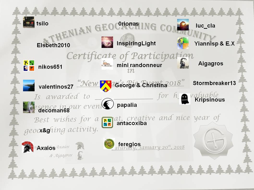 Θα θέλαμε να ευχαριστήσουμε μέσα από την καρδιά μας, όλες τις φίλες και όλους τους φίλους που μας τιμήσατε με την παρουσία σας και σας ευχόμαστε ολόψυχα, μια υγιή, χαρούμενη και ευτυχισμένη Χρονιά με ατελείωτο Geocaching και πολλές πολλές ευρέσεις !!
